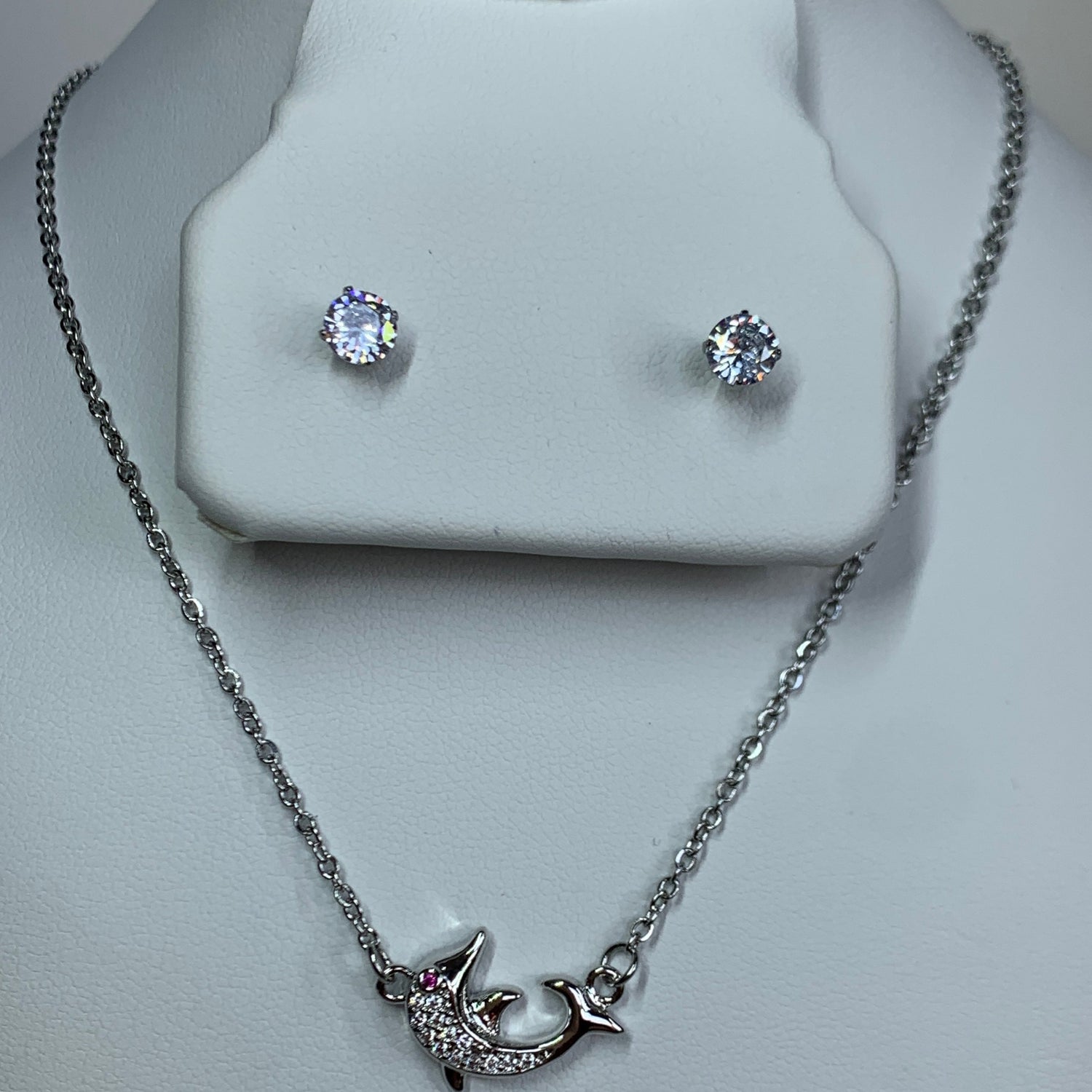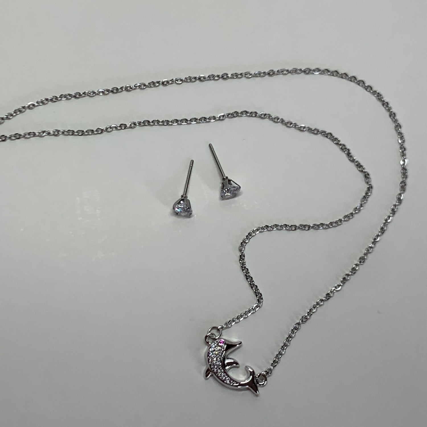 cadena ovalada con delfín y arete de acero inoxidable con circonia cúbica